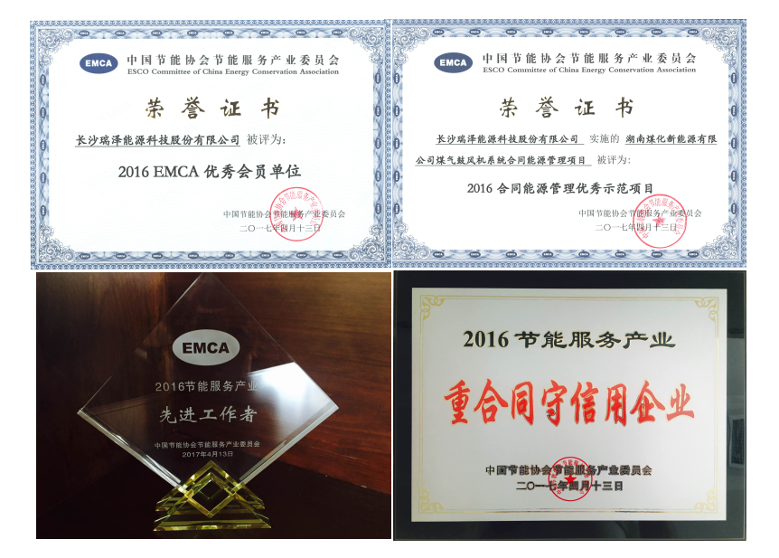 會上,瑞澤能源榮獲“2016年節(jié)能服務(wù)產(chǎn)業(yè)重合同守信用企業(yè)”“EMCA優(yōu)秀會員單位”和“2016合同能源管理優(yōu)秀示范項目”獎項,公司總經(jīng)理榮獲“2016年節(jié)能服務(wù)產(chǎn)業(yè)先進工作者稱號”。
